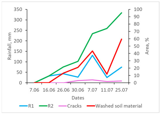 Change in soil surface status of grey forest soil in model experiment; R1—the amount of rainfall from the last measurement, R2 —accumulated rainfall from the start of the experiment. The projected area, occupied by washed soil material, was determined from photos of the soil surface taken during the experiment [40]. The information on rainfall was collected from the meteorological station near the experiment site (http://www.pogodaiklimat.ru/weather.php?id=27605 (accessed on 25 May 2021)).
