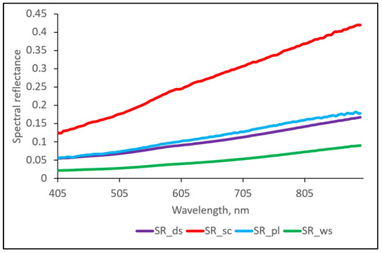 Spectral reflectance of soil samples with different state of soil surface. SR_ds and SR_ws—average spectral reflectance of dry soil surface and wet subsurface layer of 30 sample points, respectively, measured in the field on 15 August 2019; SR_sc—spectral reflectance of soil crust; SR_pl—spectral reflectance of sample of ploughed soil layer.