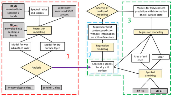 Process flow chart: (1) modelling of SOM content from the field data and selection of Sentinel-2 images with dry soil surface; (2) modelling SOM content from Sentinel-2 images with dry soil surface; (3) accounting for soil surface state when modelling SOM content from Sentinel-2 data for the dates with dry soil surface. SR_ds and SR_ws—spectral reflectance of dry soil surface and wet subsurface layer, respectively, measured in the field on 15 August 2019; SR_sc—spectral reflectance of soil crust, SR_pl—spectral reflectance of sample of ploughed soil layer.