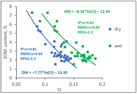 Relationship between CI and SOM content for the dry surface and wet subsurface layer based on the field data collected on 15 August 2019.