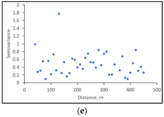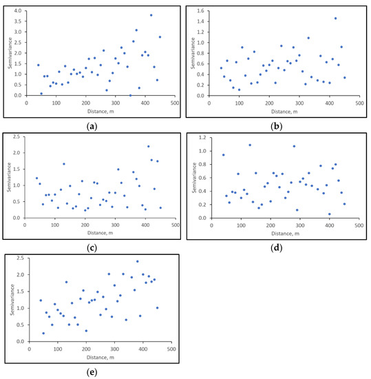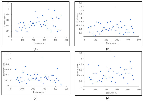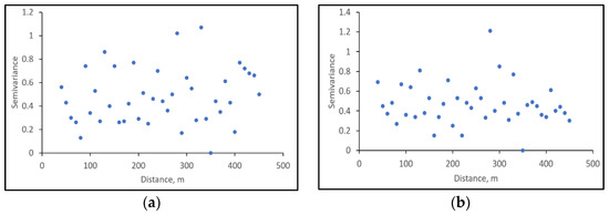 We also checked for spatial autocorrelation of the residuals for models from both spectral reflectance of the dry surface and wet subsurface layer to ensure that it did not affect our results. For this, we used a semivariogram by analogy with [68]. First, we calculated the residuals for the best regression model with the stats package [66]. Then, we added this information to the attribute table with coordinates of sample points in ILWIS Academic 3.3 and calculated the semi-variance with a lag spacing of 10 m. The semivariogram was created in Microsoft Excel.
