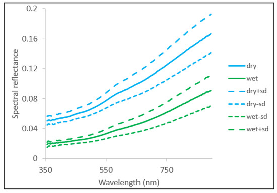 The dry soil surface layer has a higher spectral reflectance than that of the wet subsurface layer (Figure 9). The deviation of spectral reflectance from the average in both cases increases when moving from the visible to near-infrared spectral range as this range is more sensitive to the variations in soil moisture content. Therefore, the visible range is suitable to distinguish between the dry and wet soil surface independent of differences in moisture content.
