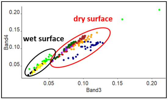 When reflectance values for all Sentinel-2 data and proximal sensing data were positioned in the Band 3 to Band 4 spectral space, we found that two distinct clouds of points were formed (Figure 10). The first cloud was concentrated around the points corresponding to the wet subsurface layer; the second cloud was located around the points corresponding to dry surface layer. Therefore, we considered that the first cloud was formed from the points where the soil surface was wet at the time of Sentinel-2 data acquisition and the second cloud was formed from the points where the soil surface was dry.