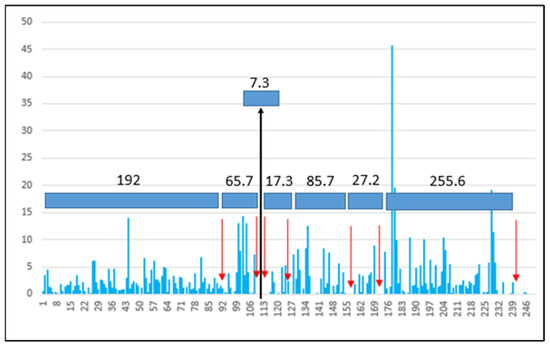 Rainfall plot for the year 2019 for the test field: red arrows indicate Sentinal-2 image acquisition on 2 April 2019—day 92; 17 April 2019—day 107; 20 April 2019—day 110; 5 May 2019—day 125; 6 June 2019—day 157; 19 June 2019—day 170; 28 August 2019—day 240. Values above the colored blocks show atmospheric precipitation accumulated between the studied dates. Rainfall amount (mm) is presented on the OY axis and the number of a day in the year on the OX axis.