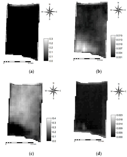 The image acquired on 19 June 2019 was the exception. The soil surface on that date was classified as dry but the application of the regression model developed for the dry surface resulted in a higher RMSE than when we used the model developed for the wet subsurface layer for this date.