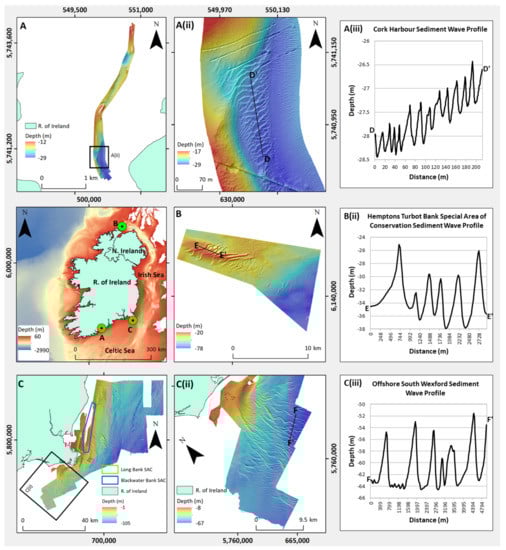 Map showing the location of the three study sites with details of sediment waves images on MBES bathymetric data. (A) Cork Harbour high-resolution bathymetry displaying extent of (A(i); A(ii)) South Cork Harbour with the line D–D’ for the sediment wave profile in (A(iii)); (B) Hemptons Turbot Bank SAC low-resolution bathymetry (acquired from EMODnet) with the line E–E’ for the sediment wave profile in B(ii); (C) Offshore South Wexford (OSW) low-resolution bathymetry (acquired from EMODnet) displaying extent of C(ii) (in black) and the extent of the Blackwater Bank SAC and the Long Bank SAC (ii); C(ii)) South–West OSW with the line F–F’ for the sediment wave profile in C(iii).