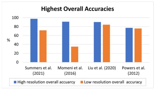 The highest overall accuracy for the highest-spatial-resolution data from this study and other studies within the literature employing multiple spatial resolutions within classification.