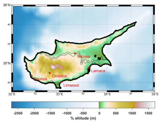 The four biggest cities of Cyprus and Omodos, a mountainous site at 800 m altitude on Troodos Mountains, were chosen: