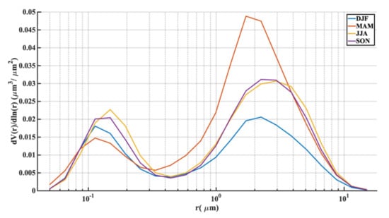 A climatology of direct sun retrievals is presented in Table 2. AOD was highest in May-August and lowest during January and December, which is similar to the pattern reported for other Eastern Mediterranean sites as well [26,27,88,89]. AE follows a more complicated pattern with highest values in August and lowest in April and May. AE is associated with particles’ size, with higher values indicating more small particles in the mixture. This seasonality suggests that mixtures containing large particles were more frequent in spring. The seasonal mean size distribution of columnar aerosol mixtures in the area was calculated using the inversion product of AERONET and is presented in Figure 3. It is clear, that large particles were dominant in aerosol mixtures during spring, which denotes significant contribution from dust aerosols. In winter, aerosol mixtures generally contained fewer large particles relative to other seasons. Small particles dominated the mixtures during December-February, which were usually linked with anthropogenic activities and combustion particularly. We should also notice that the period when anthropogenic aerosols played the greatest role was when AOD had the lowest values.