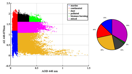 In Figure 4, the commonly used aerosol classification following the method of Dubovik et al. [90] is presented. This method was structured using the climatology of AOD and Ångström exponent of AERONET stations where the dominant aerosol type is well known, to set threshold values for classifying the mixtures. The drawback of this approach is that these threshold values could differ in cases of complicated aerosol mixtures. In urban areas, it is very rare to have a mixture where only a single type of aerosols could be identified. Hence, the classification should be considered as an identification of the dominant type of particles that have optical properties that are closest to the measured ones. Utilizing this scheme, we found that 25% of the recordings were dominated by dust particles and also a considerable part is characterized as mixed (co-occurring big and polluted particles). Dust particles in the area could be originating either from the Saharan Desert or Arabian Peninsula. Marine and continental aerosols were found in 13% and 16% of the cases, which were associated with very low AOD values. Biomass burning type was rare in the area (2% of the cases) but was present when AOD was high, which translated to a relative significant radiative effect.
