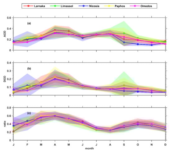 (a) Monthly average climatological values of AOD at 550 nm (upper panel), (b) DOD at 550 nm (middle panel), (c) the ratio DOD/AOD (lower panel) from MODIS/MIDAS. The presented values are averages of the four nearest pixels to each of the five locations.
