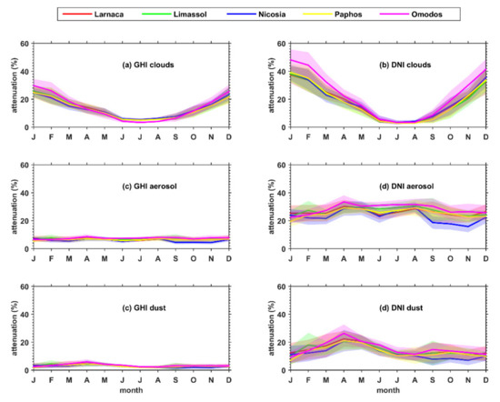 The annual cycle of the attenuation by aerosols was not as pronounced as the annual cycle of the attenuation by clouds. Attenuation by aerosols was stronger in spring and summer and weaker in winter. Maximum attenuation in April and May (8–10% for GHI and 27–32% for DNI) was mainly due to increased levels of dust. In autumn, dust and total aerosols had a noticeably weaker effect on GHI and DNI in Nicosia with respect to the four other locations.