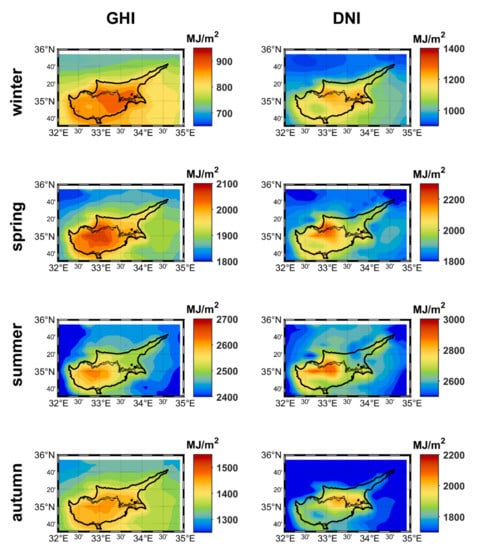 Climatology of the GHI and DNI was developed using SSR simulations based on MODIS AOD and CMF from CM SAF-SARAH2.1. The seasonal integrals (i.e., cumulative GHI and DNI) for the four seasons of the year are presented in Figure 8. Despite the small geographical extent of Cyprus, Troodos Mountains seem to have drastic effect on the spatial variability of solar potential, especially for DNI.