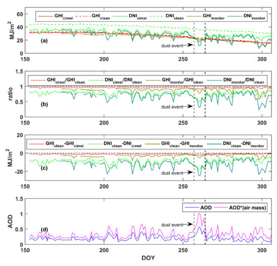 Aerosols are among the most significant attenuators of solar radiation over the Mediterranean basin [25,26,27,28,29,30]. In summer, cloudy conditions are rare at Cyprus, and aerosols play a key role in the formulation of the levels of solar radiation that reaches the surface (SSR) [15]. The origin and the composition of aerosols over Cyprus vary significantly. Natural and anthropogenic aerosols originate from local sources, with their composition varying temporally and spatially. Desert dust is frequently transported over Cyprus, either from North Africa or from Middle East, while air masses coming from Turkey and Syria may transfer biomass burning aerosols [25,31,32,33,34,35,36]. Dust aerosols, not only attenuate solar radiation, but are also responsible for degradation of PV’s performance when they are deposited on the panels (soiling) [37,38]. In addition to their direct radiative effects, aerosols act as cloud condensation nuclei, affecting the formation, the lifetime and the optical properties of clouds (indirect effect) [39,40]. Indirect radiative effects of dust are complex and depend strongly on its physical and chemical properties (i.e., the origin of dust) [41,42,43]. Given that dust is frequently present in the aerosol mixture at Cyprus, it could have a significant impact on energy production from PV and concentrated solar power (CSP) plants.