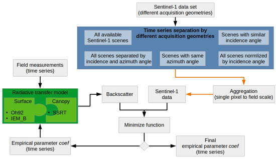 Figure 2 schematically explains the calibration approach from Weiß et al. [26] that was applied. Depending on the analysis approach, the images of the dense Sentinel-1 time series were separated into different subsets (blue box in Figure 2). An overview of the data subsets used is provided in Table 5. Additionally, variations due to diverse spatial aggregation scenarios of the Sentinel-1 backscatter were investigated. An overview of the analyzed aggregation scenarios is given in Table 6. For each (sub)set and each aggregation scenario, the empirical parameter is calibrated separately. Therefore, the sum of the squared difference between the modeled and measured VV-polarized backscatters were used as a minimization function to calibrate the parameter and thus the transmissivity T (see Equations (6) and (7)). In the end, a final time series for and thus a final RT modeled VV polarized radar backscatter time series was obtained.