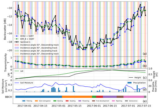 Sentinel-1 backscatter data for field point 508-1. Modeled backscatter results of IEM_B and Oh92 with SSRT (a). Different background colors (red, blue, green, and yellow) represent Sentinel-1 images with various acquisition geometries (a,b). Calibrated transmissivity T for each time step (b). In situ data of vegetation height and LAI (c). Soil moisture and precipitation measurements (d). Observed vegetation phenology according to the BBCH scale [57] (e).