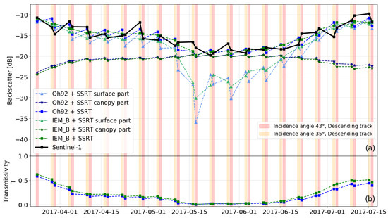 Sentinel-1 time series and RT model results considering images with an ascending orbit direction and an azimuth angle of −15° (relative to north) (a). Different background colors (red, blue, green, and yellow) represent Sentinel-1 images with various acquisition geometries (a,b). Calibrated transmissivity T (b).