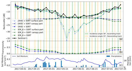 After analyzing the effects of different azimuth and incidence angles on the backscatter, the dense time series was separated into four subsets with the same orbit and, thus, the same acquisition geometry (“Sep-50 m”). The transmissivity T was calibrated by the empirical parameter for each subset individually, and the results were reassembled into one time series afterwards. The trend mismatch between the data modeled and the Sentinel-1 data of consecutive time steps with various acquisition geometries after the beginning of June, which was detected in Figure 3, was resolved. Figure 8 shows these calibrated model results of a reassembled dense time series. Furthermore, compared to Figure 3, a sensitivity increase in the IEM_B model results in backscatter changes due to varied incidence angles being observed. The resolved trend issue and the higher incidence angle sensitivity effect result in dynamic transmissivity values by separately calibrating the empirical parameter for varying time series subsets. Contrarily, in Figure 3, no differences of T between consecutive time steps are visible, but various values for T can be observed in Figure 8. The model combination Oh92 with SSRT shows variations in T (between Figure 3b and Figure 8b) only after mid-July (flowering to senescence), whereas IEM_B exhibits variations during the early (tillering) and late (flowering to senescence) phenology stages. The calibrated parameter seems to compensate for the lack of RT models in handling various acquisition scenarios in our model setup. This compensation might be forced by the model architecture and/or calibration and needs further investigation. During the phenology stages flowering to senescence, higher T values (Figure 8b) as well as higher surface model contributions (Figure 8a, triangle symbol) are observed for IEM_B and Oh92 for shallow than for steep incidence angles. Theoretically, by considering a canopy layer of 90–100 cm, the electromagnetic wave travels a farther distance through the canopy for shallow incidence angles than for steep incidence angles. Under the assumption that farther distances (shallow incidence angle) through the canopy leads to lower canopy transmissivity of the electromagnetic wave, the modeled T and the model surface component of Oh92 and IEM_B should be lower for shallow incidence angles and not the other way around. Although the model theory described cannot be seen in Figure 8, Figure 4 shows this theoretical behavior of the surface model component (Figure 4a, triangle symbol) and transmissivity (Figure 4b). However, comparing Sentinel-1 and the total modeled backscatter within Figure 4, a trend mismatch between consecutive time steps for phenology stages flowering to senescence and, therefore, differences between the Sentinel-1 and RT model total backscatter are observed.
