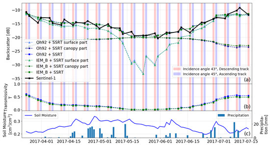 Sentinel-1 VV backscatter time series and RT model results for canopy and surface scattering considering images with similar incidence angles (43°, 45°) (a). Different background colors (red, blue, green, and yellow) represent Sentinel-1 images with various acquisition geometries (a,b). Calibrated transmissivity T (b). Soil moisture and precipitation measurements (c).