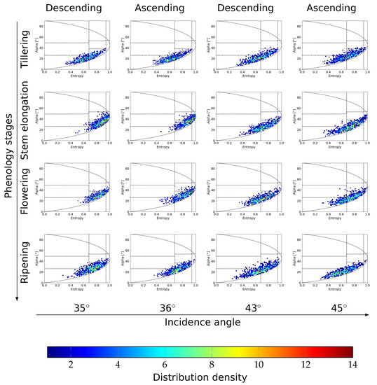 Polarimetric entropy to scattering alpha angle plane of dual (VV/VH) polarimetric eigen-decomposition for different incidence angles (x-axis) and various phenology stages (y-axis) of wheat field 508. Colors from blue to red symbolize the distribution density. The H-alpha plane segmentation for dual (VV/VH) polarimetric eigen-decomposition is from Ji and Wu [56].