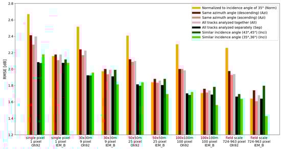 Validation of the RT model calibration approach for the various dense time series (sub)sets was performed by a leave-one-out-cross-validation method. The mean ubRMSE of the Sentinel-1 and modeled data for all measurement field points is illustrated in Figure 10. The results are categorized by different spatial backscatter aggregations (x-axis), RT model combinations (x-axis), and (sub)sets of the dense Sentinel-1 time series used (color separation). It is expected that intra-field variances are reduced by averaging, and in this way, agreements between the model and observations might be facilitated. However, this analysis wants to quantify the model performance of the different aggregation scenarios in dB to understand the loss of precision where intra-field variance is vital. Comparing the results of Oh92 with SSRT and of IEM_B with SSRT for various Sentinel-1 data (sub)sets, greater variabilty in ubRMSE is shown for the Oh92 model combination. For both models as well as for the various data (sub)sets, spatial aggregations lead to improved ubRMSE values. The IEM_B and Oh92 results reveal improvements on the pixel to field scales by up to 0.5 dB. The best model fit in terms of ubRMSE is provided when using a time series that only considers Sentinel-1 images with incidence angles of around 35° (light green). Moreover, the ubRMSE results in a similar range to that of the best model fit are shown by using a data set with incidence angles of 43° to 45° (dark green) or if all acquisition geometry scenarios are analyzed separately (black). Overall, the IEM_B model combination reveals slightly better results than the Oh92 model combination for the different categorizations. Both model combinations analyzed by using only images with incidence angles of 35–36° (light green) compared to the entire Sentinel-1 data set (gray) improved by up to 0.3 dB. The ubRMSE of the best model fit (light green) is 1.43 dB for IEM_B and 1.64 dB for Oh92. Summarizing the results, it can be stated that the best model agreement is obtained by aggregation to the field level and by using steep incidence angles. The differences between single pixel and 30 × 30 m resolution are up to 0.2 dB, and the differences between single pixel and field scale aggregations are up to 0.5 dB.