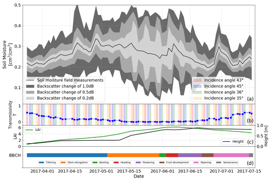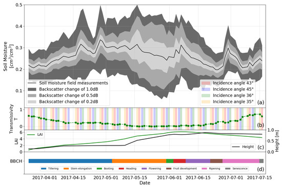Sensitivity analysis of RT model Oh92 with SSRT. Deviations in the backscatter of 0.2 dB, 0.5 dB, and 1.0 dB are correlated with soil moisture uncertainty (a). Different acquisition geometries (indicated by the colors red, blue, green, and yellow) of the data set used and the calibrated transmissivity for each time step (b). In situ data of vegetations descriptors height and LAI (c). Vegetation phenology observed according to the BBCH scale [57] (d).