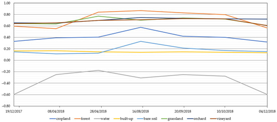 As shown in Figure 2, water and forest can easily be detected throughout the whole season, whereas built-up and bare soil class show a similar pattern, except in August, which can easily be resolved by using additional spectral indices (e.g., SAVI, normalized difference built-up index (NDBI) [69]). Since the cropland class in the investigated study area is consisted mostly of single cropping plant systems (e.g., cereals, maize, and potato), characteristic crop phenology pattern can be recognized, which consists of the sowing (March), growth (from April to August), and harvest (September). The biggest inter-class overlap for separating the vegetation occurs between grassland, orchard, and vineyard. Therefore, in this research, Jeffries–Matusita (JM) distance was used as a spectral separability measure [10,70].
