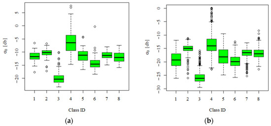 Mean (a) VV and (b) VH backscatter values, for each LC class investigated. The classes are represented as follows: 1 = Cropland; 2 = Forest; 3 = Water; 4 = Built-up; 5 = Bare soil; 6 = Grassland; 7 = Orchard; 8 = Vineyard.