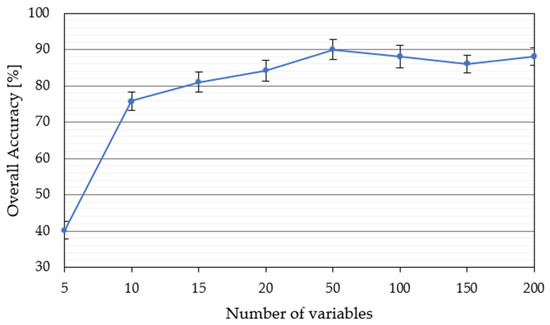 Before any classification scenario was conducted, the feature selection was performed for SAR (i.e., S1) and optical (i.e., S2) time-series data, as well as their ancillary features. As shown in Figure 4, major improvements in the overall accuracy are perceptible up to 50 features. An increase from the aforementioned number of features in the classification model provides a negligible improvement in the OA in relation to the computational cost and processing requirements. Therefore, one-fourth most important features from the overall number of input features available for each classification scenario were used in this research.
