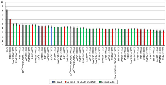 According to the feature importance approach described in Section 3.2.2, Figure 5 shows the 50 first features sorted by the decreasing MDA. Color coding was used, depending on the source of the input feature (e.g., S1 or S2 band, derived ancillary features from S1 and S2). The digital elevation model (DEM) was the most important input feature for the classification, followed by the summer B4 (i.e., Red) S2 band, and winter MSAVI and NDWI S2 indices. Overall, for S1, the VH polarization band was the most important feature among the first 50 features, whereas GLCM Mean, Variance, and Correlation were the most important features among the nine textural features used in this research. The former variable (i.e., VH) is expected to be included in the final classification model, since it contains volume scattering information [76], whereas the latter GLCM features have already been proven for vegetation mapping [20,41].
