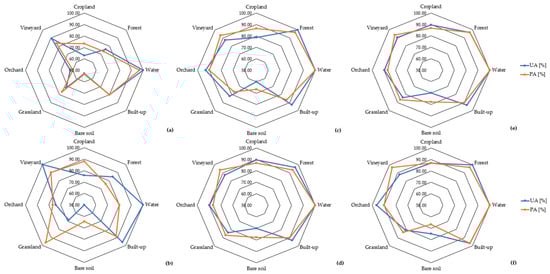 Spider chart representing the User’s (UA) and Producer’s accuracy (PA) for each LC class in the: (a) S1; (b) S1 with GLCM; (c) S2; (d) S2 with Indices; (e) All; (f) S1 with S2 classification scenario.