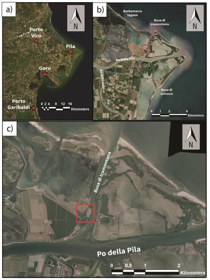 This (a) Po River Delta location and (b) main branches at the tip of the delta. (c) The tidal flat is located in the southernmost part of the Barbamarco Lagoon (orthophoto 1:35000 from 2015 made available by the Veneto region).