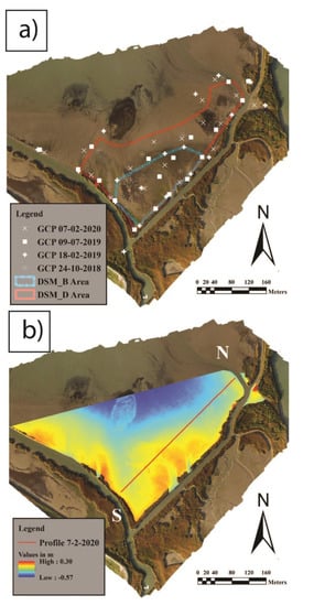 (a) Orthophoto with GCPs and the study area location and (b) DSM of October 2018 with GPS transect of February 2020.