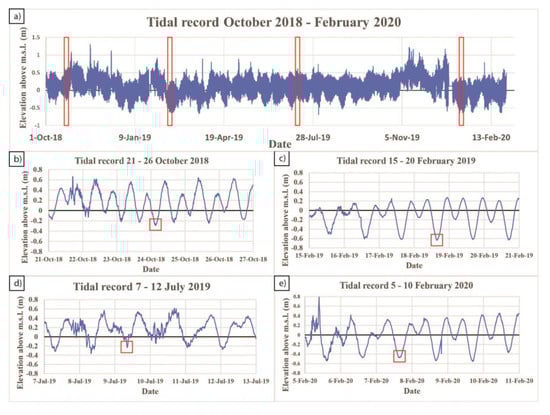 Tidal records from the tide gauge of Porto Garibaldi representing (a) the whole period of study, (b) the survey of 24 October 2018, (c) the survey of 18 February2019, (d) the survey of 7 July 2019, and (e) the survey of 7 February 2020.