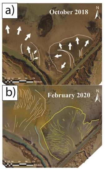 Orthophoto produced after the survey of (a) October 2018 and (b) February 2020. In Figure (a) the location of the crevasse splays are shown, as well as the creeks and how the sediment deposition occurs. In Figure (b) three depositional areas are identified: the largest crevasse splay and its small creeks are shown in yellow: They formed after the flood of November-December of 2019; in light blue, the smallest crevasse located in the south-west section is shown; in white, a large depositional area located in the west part is shown.