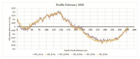 Different resolutions of the DSM profiles at 80 m (D1) and 60 m (D2) of altitude from the survey of February 2020 (transect in Figure 2b).