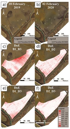 Orthophotos of February 2019 (a) and February 2020 (b) with GCP location. In figure (c–f) the DoEs are shown. (c) Variations between the B1 and the B3 of February 2019; (d–f) Variations between D1, D2, D3 of February 2020.