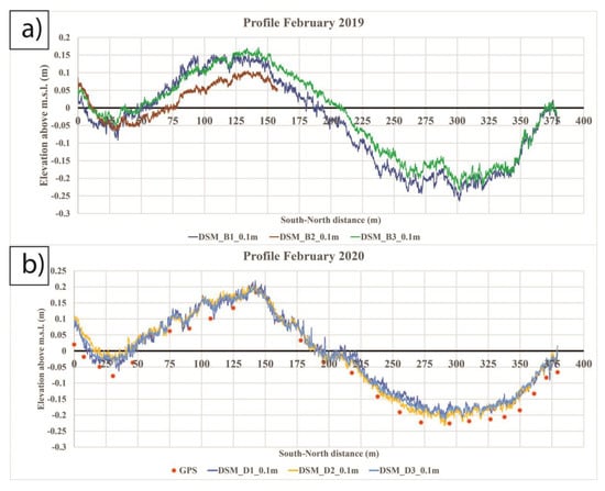 An observation of the tests on the transect surveyed in February 2020 brings to light other details. First, the DSMs values of February 2019 were extracted based on the track of the transect surveyed one year later (Figure 7a): the vertical differences in the order of 0.1 m are visible between the B2 test and the others. The B1 and B3 tests are very similar in the first 150 m of the profile, which coincide with the B2 extension; from 150 m to 300 m the B3 test shows higher elevations with respect to B1. However, the vertical difference is about 0.05 m. The differences amongst the D tests are generally lower than 10 cm (Figure 7b); in the same figure, it is notable that most of the validation points are lower than the D tests, indicating that the DSMs generally overestimate (RMSEs ≤ 4.1 cm) the elevation of the surface when compared with GPS measurements. These lower GPS values, in particular, are probably due to a systematic error occurring during the survey when the tip of the GPS pole sinks in the mud, which is a common problem in a soft-sediment environment [47].
