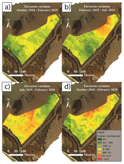 As anticipated, a DoD represents the vertical variations of an area between two instants in time, as represented by two DSMs. For this study, four-time intervals were considered: (i) from October 2018 to February 2019, (ii) from February 2019 to July 2019, (iii) from July 2019 to February 2020 and, finally, (iv) the whole period from October 2018 to February 2020 (Figure 3). DoDs were computed and analysed to understand the evolution of the tidal flat.