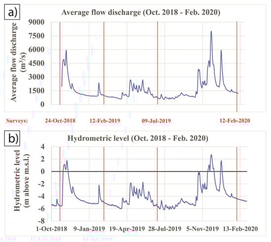 (a) Average flow discharge and (b) hydrometric level from the station of Pontelagoscuro. The dataset is provided by AIPO (Agenzia Interregionale per il fiume Po). The date of each survey is written in red.