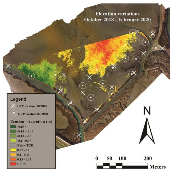 As previously explained, the DoDs were calculated reducing the domain of the DSMs to cover the same area and keep the validity of the DoDs. Unfortunately, this excludes most of the western part of the tidal flat from the analysis; hence, in order to show the vertical variations of the whole domain, the DoD between October 2018 and February 2020 was produced without filters, and it is shown in Figure 10. It is important to note that in the north-west part of the domain the GCP density is lower and the vertical variations tend to increase, as previously shown; however, these errors do not influence the reliability of a qualitative interpretation.