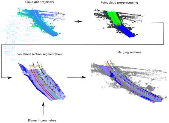 This paper presents an automatic heuristic segmentation of railway point clouds. A schematic representation of the methodology is shown in Figure 2. The methodology consists of a preprocessing step, in which each point cloud is sectioned and voxelised; a segmentation process, through which each voxelised section is segmented; a merging process, through which the segmented sections are regrouped into the whole dataset.