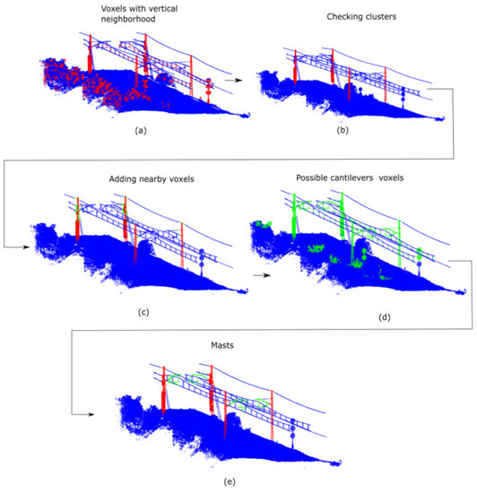 - Finally, after wiring extraction, which is presented in Section 3.2.3, masts that are not in contact with any wire are deleted. The voxels classified as masts without cantilever are referred to as , and those classified as masts with cantilever as .