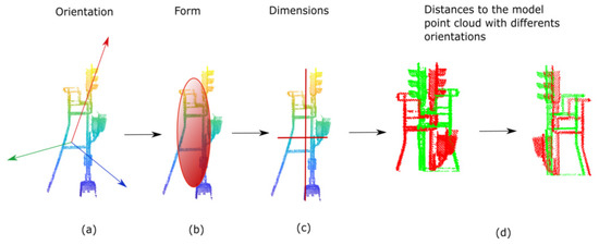As it is shown in Table 1, some models consider distances between the point cloud of the model and the element under study. To do this process correctly, they must be centred on the same point. For this reason, the centre of coordinates of each cluster is modified by applying Equation (2) to the points of the element under study. It allows the points centred in its centre of mass to be represented in the directions, setting its highest point to . This results in an easier comparison, avoiding problems with poles of variable length. The point cloud of the model is the centre in the same way. This process is shown in Figure 10c.