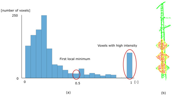 - Voxels with , , and are selected. The objective is the detection of voxels whose neighbourhood has a vertical dispersion. Then, its neighbours are added. This is necessary because masts are not isolated since they are in contact with wires. Figure 7a shows the selected voxels.