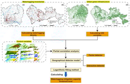 First, the density of waterlogging per unit area within each watershed unit was calculated based on the waterlogging record. Several metrics were utilized to measure green infrastructure composition and spatial configuration (area proportion, biophysical parameter, and spatial configuration). Second, other auxiliary variables, including elevation, slope, precipitation, and drainage density, were adopted as control variables. Then, the urban waterlogging density was regarded as a dependent variable, while the UGI composition and spatial configuration were considered explanatory variables. Fourth, the correlation between urban waterlogging density and explanatory variables was examined through partial correlation analysis. Fifth, the interaction effect of UGI’ factors on waterlogging we examined through the geographical detector model. Lastly, we quantified the threshold level of UGI affecting urban waterlogging using the logarithmic fitting method.