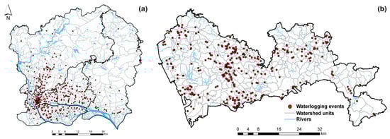 The urban waterlogging events and watershed units for (a) Guangzhou central urban district and (b) Shenzhen.