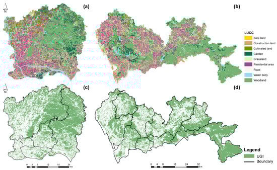 (a,b) The land cover maps and (c,d) UGI maps for (a,c) Guangzhou central urban district and (b,d) Shenzhen.