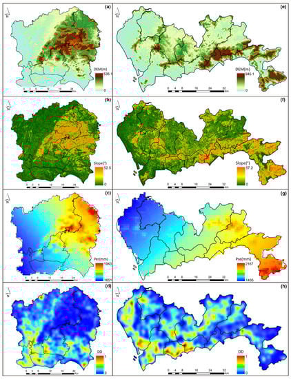 Urban waterlogging is the result of the combination of environmental conditions and human activities. In addition to the significant influence of land cover composition (UGI) on urban waterlogging, the urban microtopography, rainfall, and drainage facilities also have a non-negligible impact on urban waterlogging [,]. In order to accurately quantify the effect of UGI on urban waterlogging, it is essential to exclude the influence of other relevant variables on waterlogging. Therefore, the topography (elevation and slope), average precipitation, and drainage density are adopted as control variables to avoid these distractions (Figure 6). Firstly, the topographic variables of elevation and slope were calculated from the DEM data through ArcGIS Pro. Then, as the urban waterlogging record does not include the specific years, this study used the average cumulative precipitation (Pre) reflecting the spatial distribution difference of rainfall during this period. Lastly, we calculated the drainage network density (DD) by line density module in ArcGIS pro to reflect the drainage capacity.