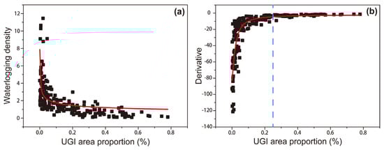 The logarithmic fitting (a) and the derivative (b) between UGI area proportion and waterlogging. The red line indicates the nonlinear fitting curve and the derivative curve, and the blue dashed line represents the threshold value.